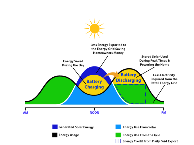 In the graph above, a great deal of your energy usage will be coming from your solar system, but instead of exporting your excess generated energy to the grid once your property does not need any more energy supply from your panels, your battery storage system will kick into action to store this excess energy. This is a far more economical process for energy consumption as your battery will be able to supply your evening and early morning energy usage when the panels aren’t generating electricity.